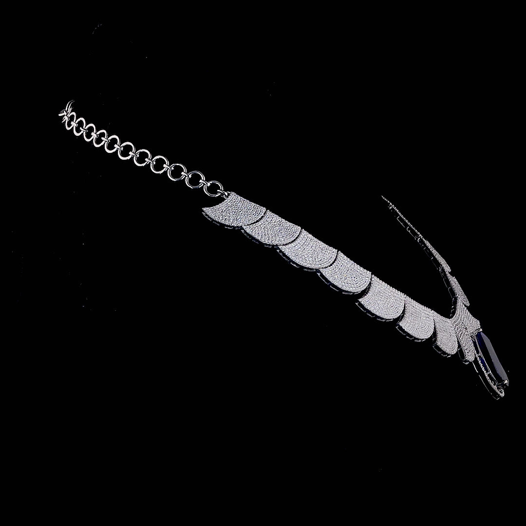 Inspired by the Queen of the Gods, this majestic sterling silver necklace evokes the beauty of a peacock's fanned tail. Shimmering, pavé-set segments cascade gracefully to a deep blue teardrop pendant, creating a statement of divine and regal power.