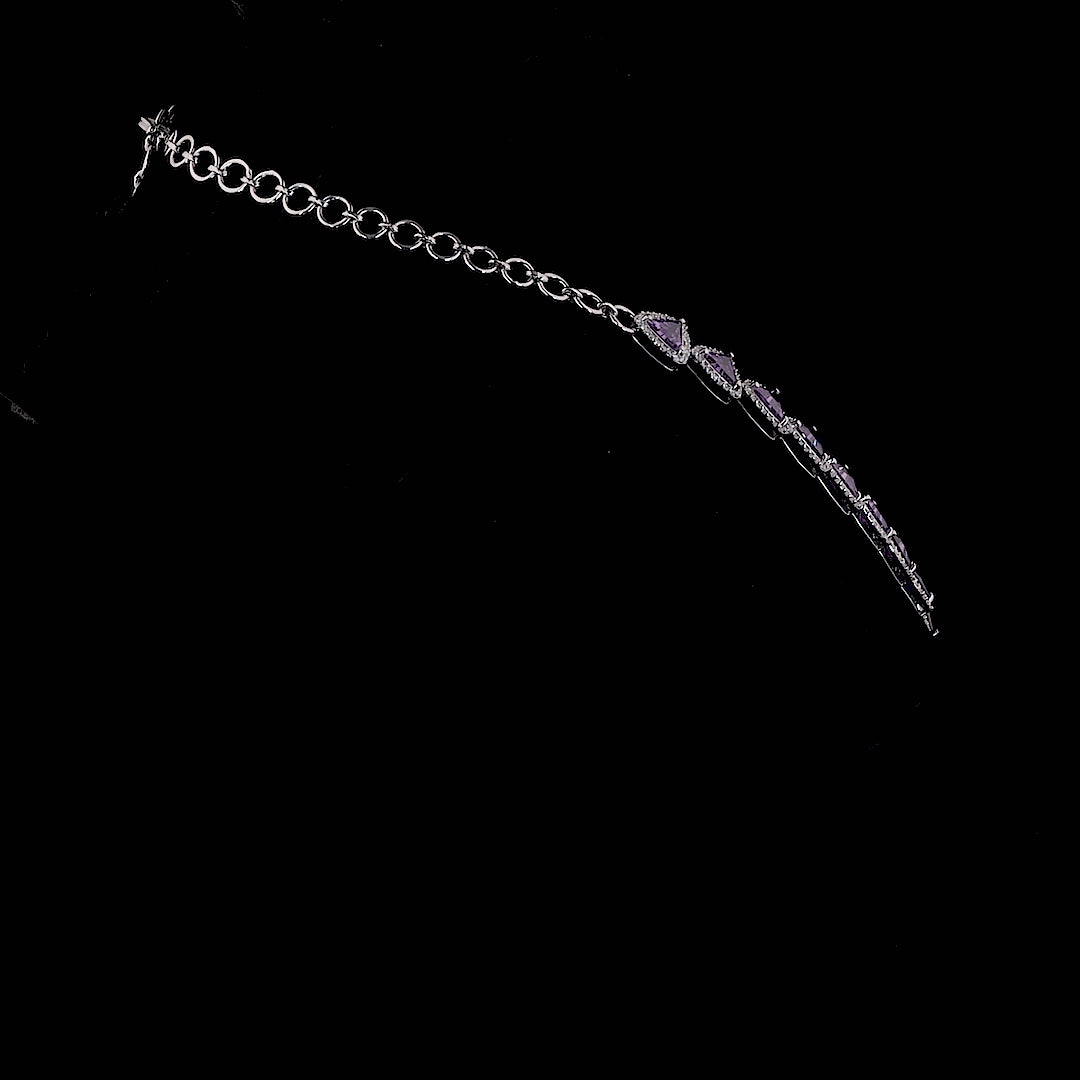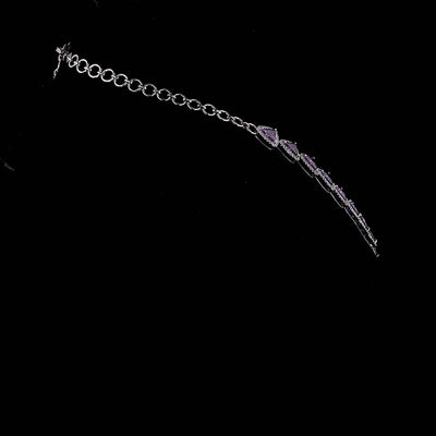 A collar of cool, tranquil amethyst triangles, each haloed in diamonds, reflects the wisdom and serenity of the goddess Athena. The design is both powerful and poised, with a final amethyst pendant for focus.